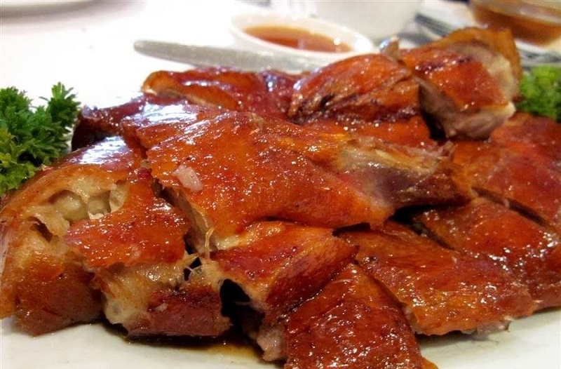 Đây là một trong những món ăn ngon mà bạn không nên bỏ lỡ khi đến đây. Sau khi vịt được sơ chế sạch, người ta đem ướp vịt với các gia vị như hành, hạt tiêu, quả móc mật,… nhồi vào trong bụng của con vịt, bên ngoài quét một lớp mật ong vàng óng rồi cho lên bếp nướng. Phần nước vịt sau khi quay xong sẽ dùng để chấm với thịt vịt, khi thưởng thức bạn có thể ăn kèm với măng chua rất là hấp dẫn.