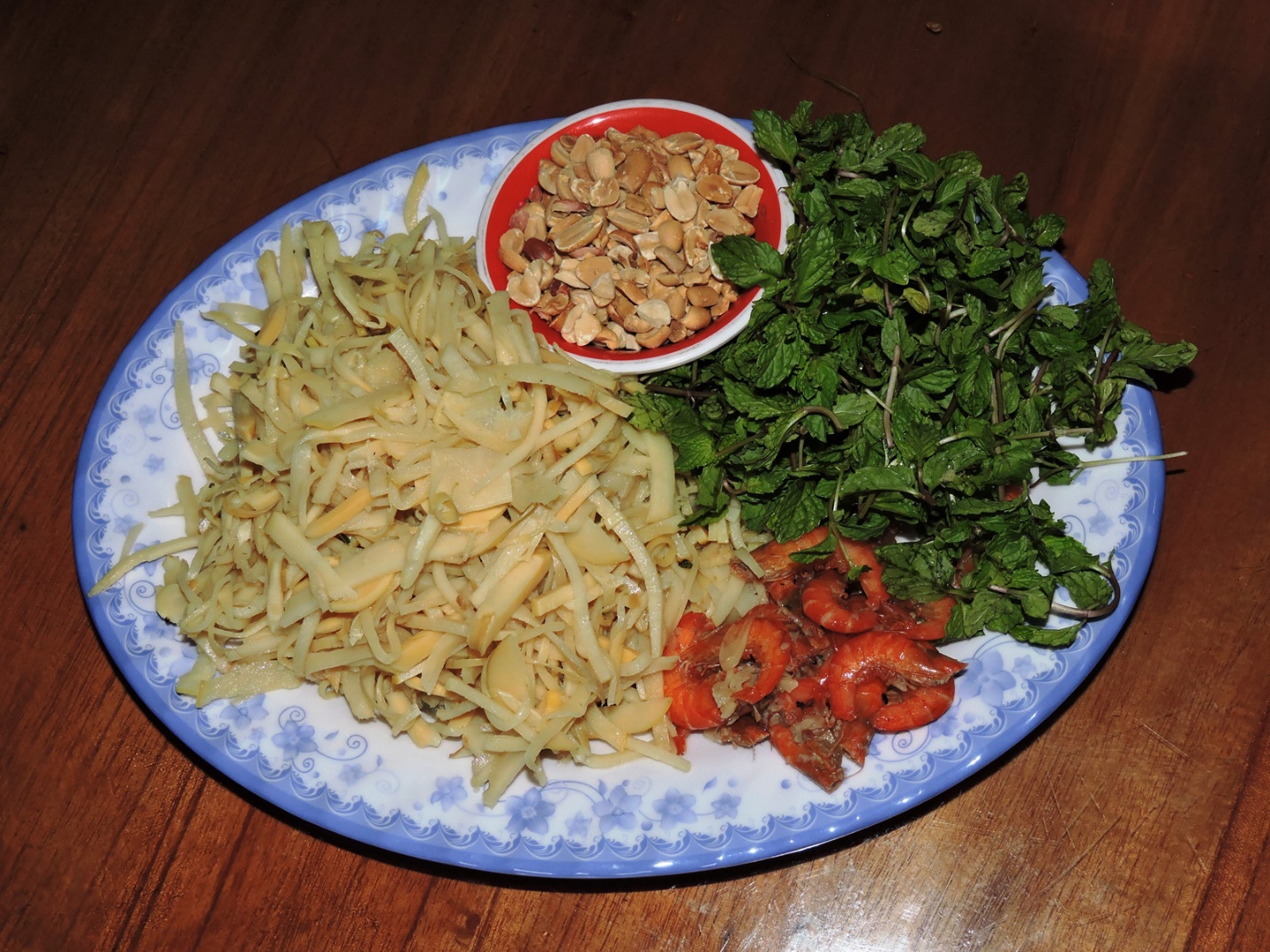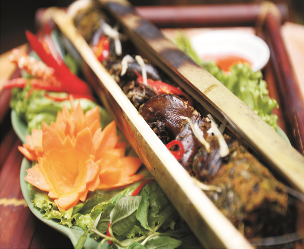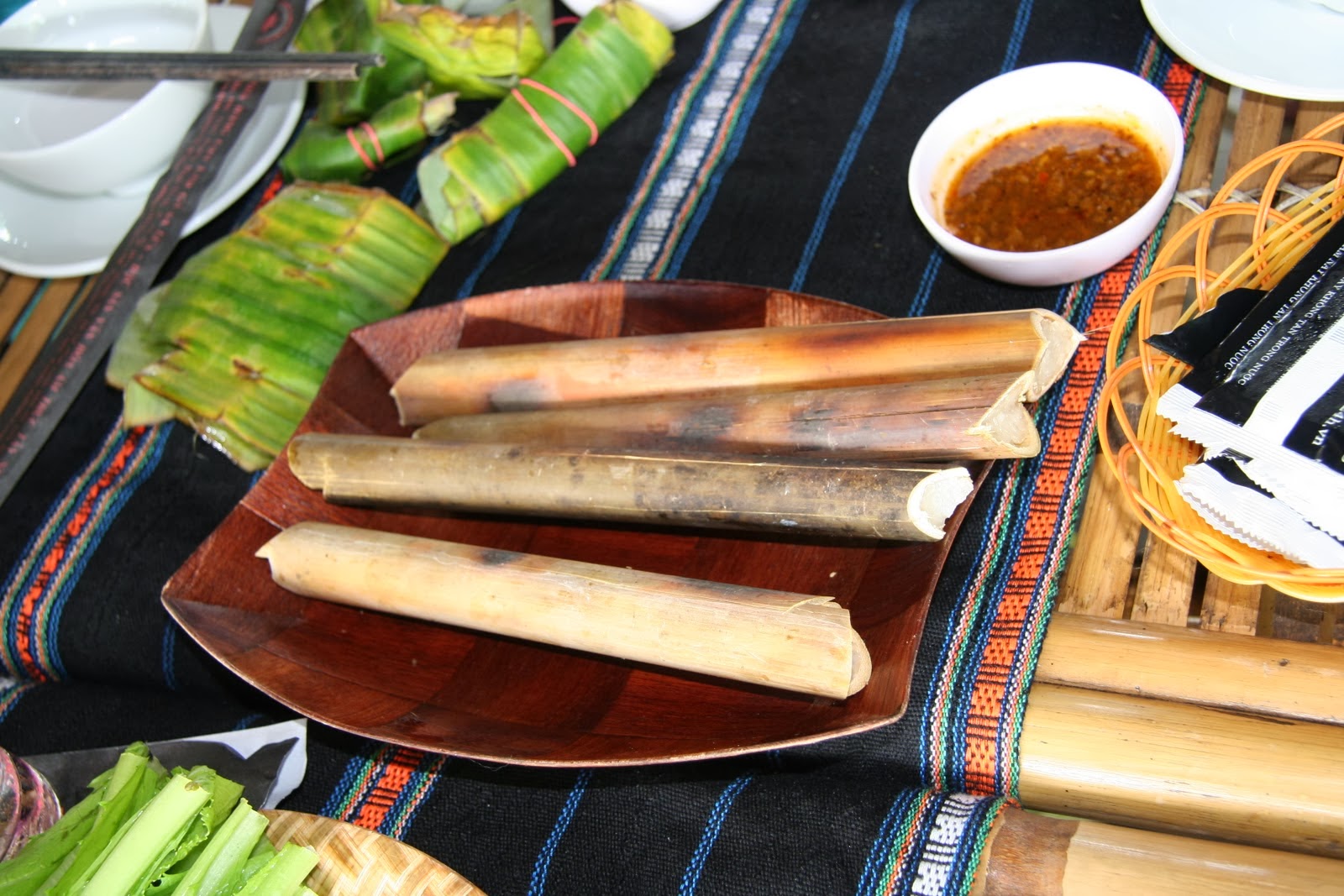 Món ăn này là sự pha trộn giữa các loại rau rừng và thịt bò thái lát mỏng. Thịt bò được làm chín bằng ống tre nên có mùi tre cháy xém rất đặc trưng. Dù nướng bằng than lửa nhưng món ăn lại không có mùi khói ám vào, thay vào đó là vị ngọt của thịt bò cùng hương thơm quyến rủ của các loại rau rừng trong món ăn.