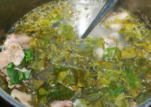 Ăn lẩu lá khổ qua rừng chỉ cần nhúng nắm lá vào nồi lẩu rồi vớt ra dùng liền thì mới cảm nhận được hương vị đặc trưng của món ăn này.