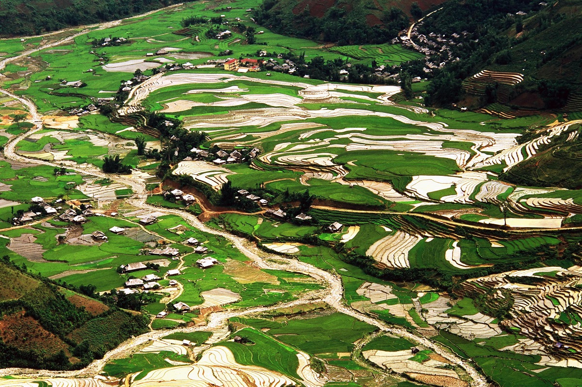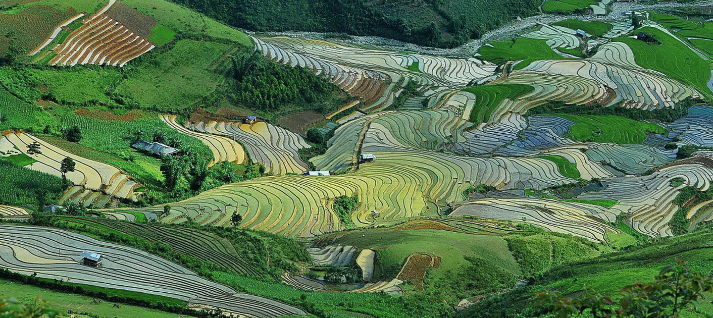 Những thửa ruộng bậc thang giống như những dòng thác lúa chảy tràn từ lưng chừng núi xuống thung lũng. Ruộng bậc thang không chỉ đem lại cuộc sống ấm no cho người dân vùng núi mà ngày càng được biết tới như một thắng cảnh “nhân tạo” đẹp tuyệt vời, là biểu tượng độc đáo của Mù Cang Chải.