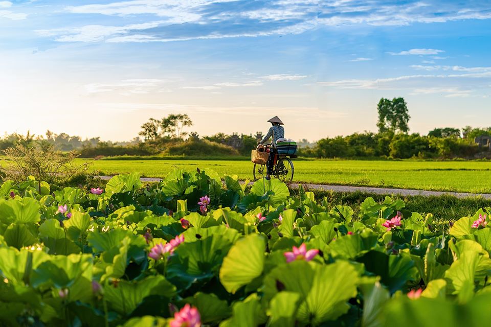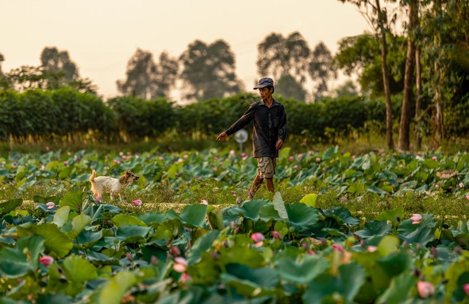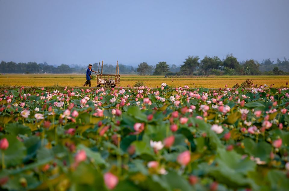 Rời xa phố thị tấp nập, về chốn miền quê thanh bình không khó để bắt gặp những cánh đồng lúa trải dài xanh ngắt. Xen kẽ trong đó là những hồ sen với sắc đỏ hồng, xanh trắng đang nở rộ. Trong hồ nước mênh mông ấy, từng cuốn sen già đâm xuống lớp bùn sâu, tìm dưỡng chất cho hạt bùi, hoa thơm, lá xanh tươi. Tất cả hiện lên như một “tấm thảm xanh” trên mặt hồ, gió bạt ngàn tỏa hương đi xa. Chính hương thơm trong lành, chân chất của sen chốn ngoại ô đã làm dịu mát cái nắng chói chang mùa hạ, khiến lòng người cảm thấy thư thái hơn sau một ngày vất vả, bận rộn.