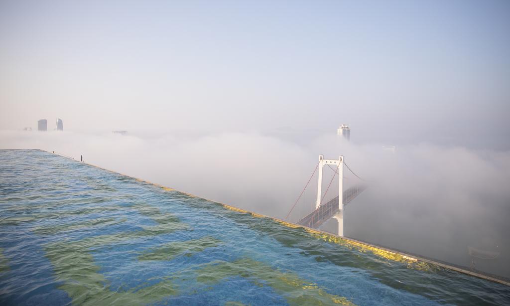 Bể bơi tại Vail Soleil Hotel có hướng nhìn xuống cầu Rồng Đà Nẵng. Ngâm mình trong làn nước mát lạnh và đưa mắt ngắm nhìn dòng sông Hàn yên bình chảy qua thành phố hiện đại, xa xa là cầu Rồng khi phun lửa khi phun mưa.
