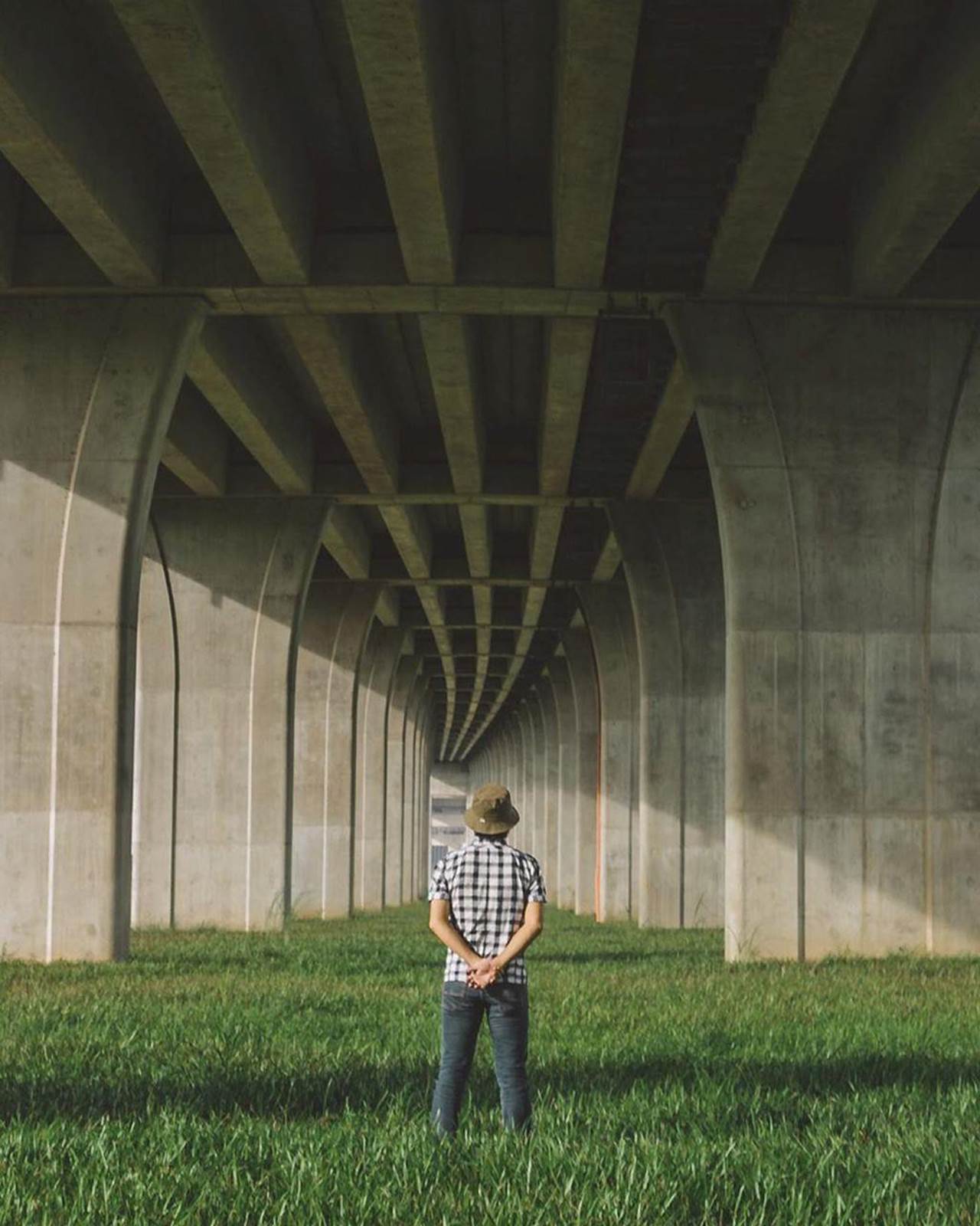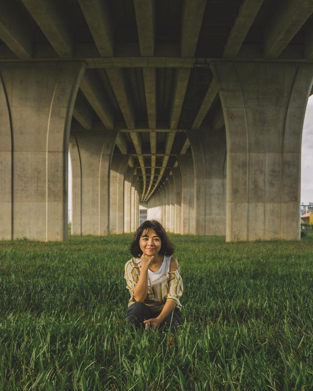 Sở hữu bãi cỏ xanh mát rậm rạp, trải rộng tít tắp cùng sự kết hợp tài tình với trụ cầu & mặt dưới thân cầu ở phía dưới, đã tạo nên hiệu ứng chụp ảnh tuyệt vời, một phông nền thần thánh để bạn tha hồ thả dáng và cho ra đời các bức hình để đời.