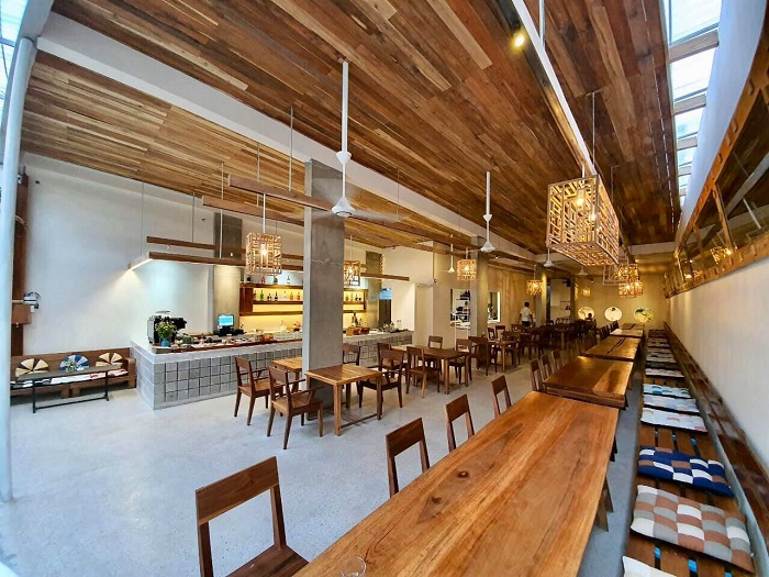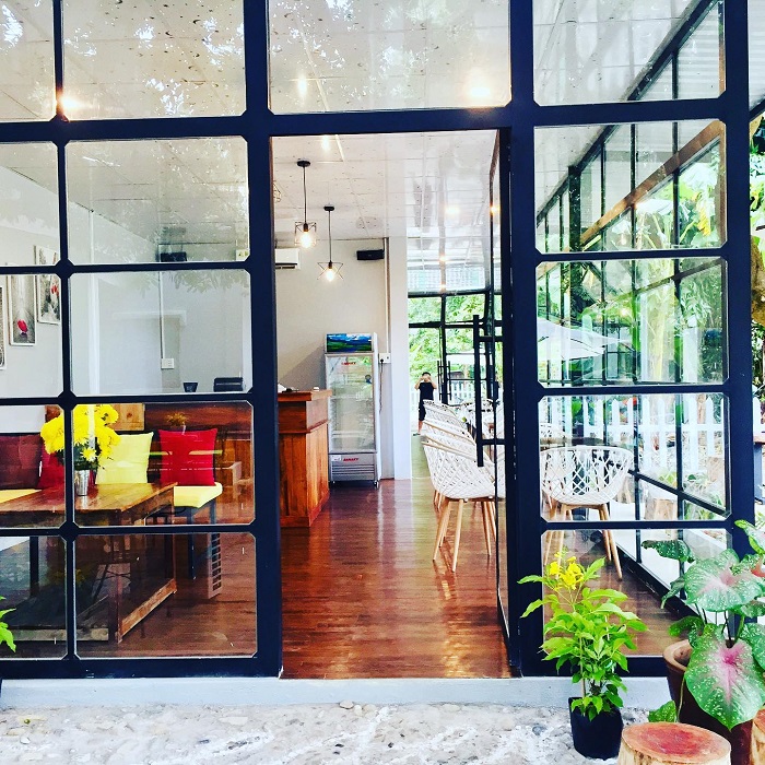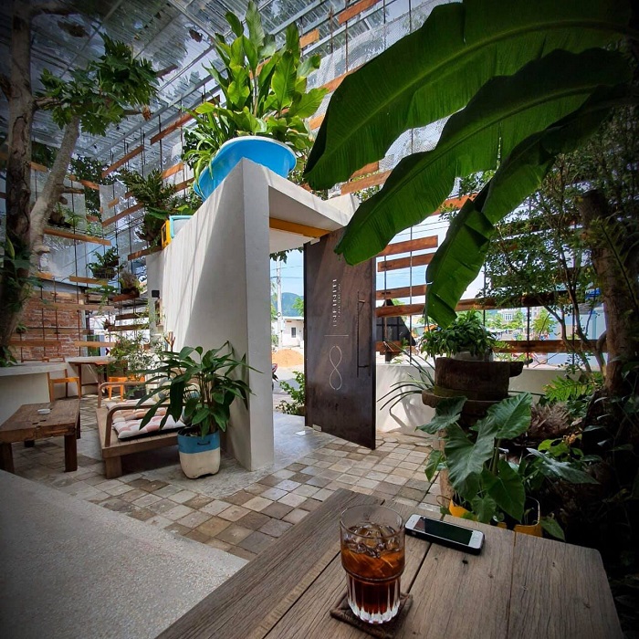 Khuôn viên quán có 2 khu vực trong nhà và ngoài trời. Khu bên trong là kiểu nhà kính với nội thất đơn giản, tinh tế, màu sắc dịu mắt như trắng, nâu đậm, xanh dương. Khu bên ngoài là những dãy bàn dành cho cặp đôi, bàn cho nhóm đông người được bày trí cách xa nhau, đảm bảo sự riêng tư cho thực khách.