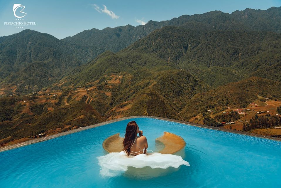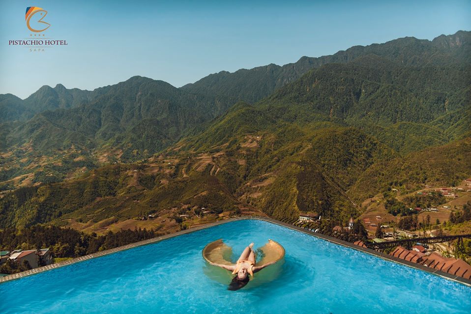 Không phải là hồ bơi vô cực xuất hiện đầu tiên, nhưng khách sạn Pistachio 4 sao ở Sapa chiều lòng du khách tới chơi Sapa bằng bể bơi vô cực cao ngất ngắm toàn cảnh dãy Hoàng Liên trùng điệp. Chưa kể, công trình bể bơi này còn được chăm chút tỉ mỉ đến mức dát vàng 9999 bao quanh bể sục, tạo nên vẻ sang chảnh chẳng nơi đâu có!