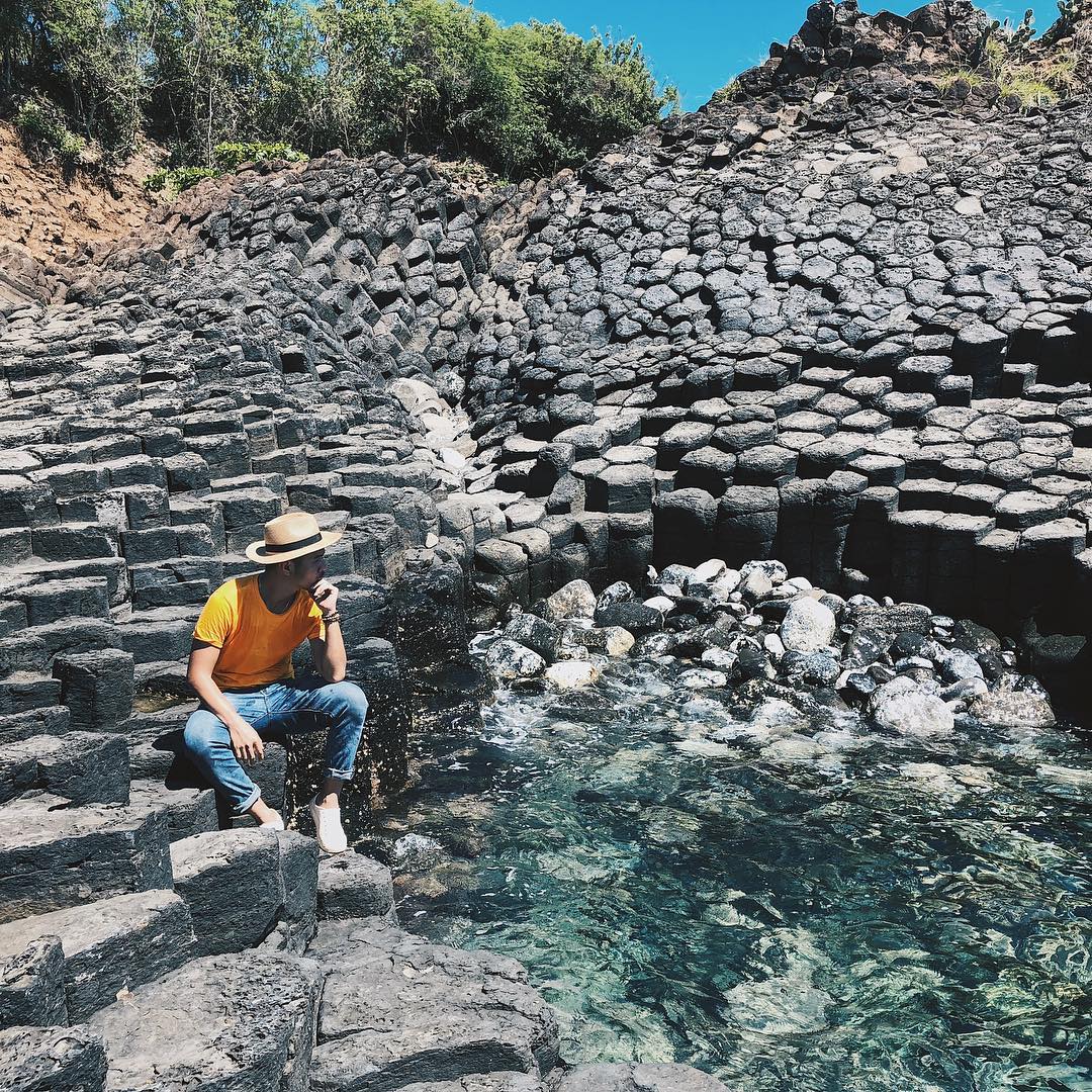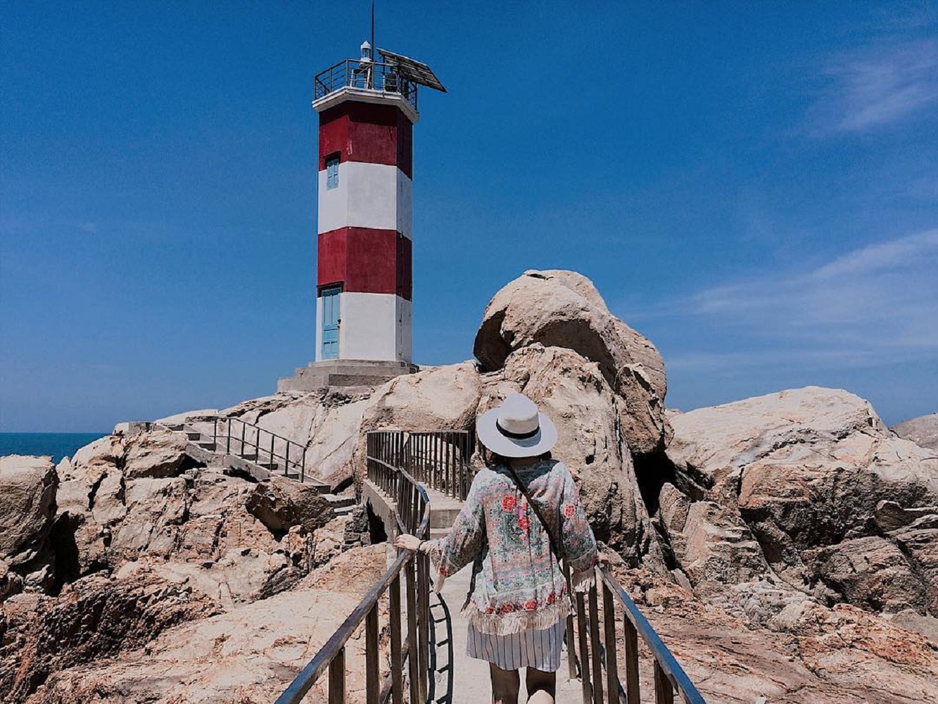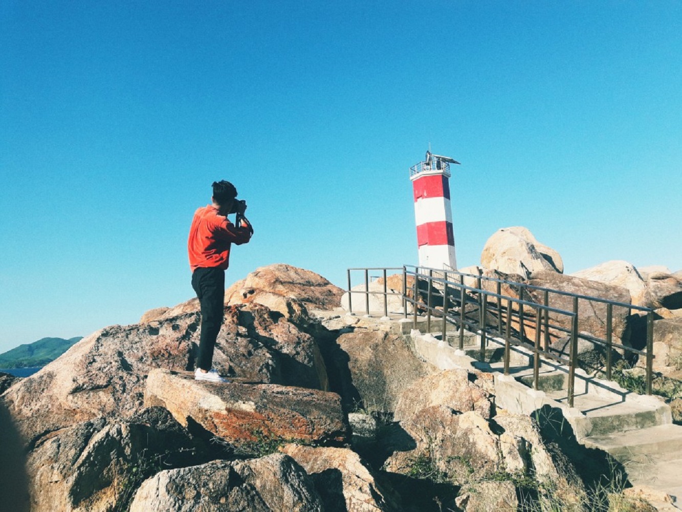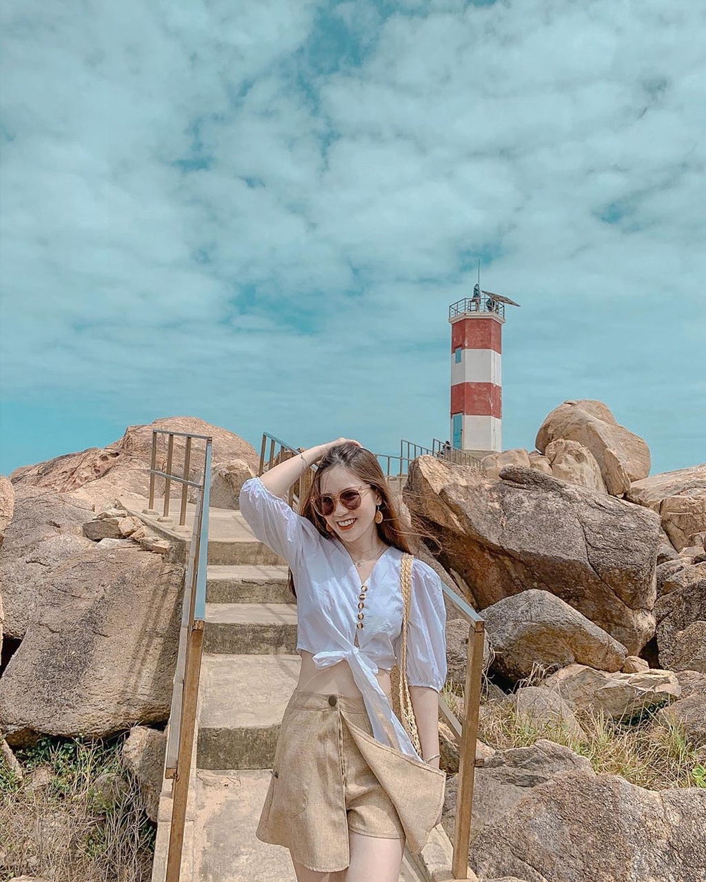 Các tảng đá ở đây được bào mòn 1 cách tròn trịa, kết hợp với nền nước biển xanh biếc lên hình sẽ trông đẹp vô cùng. Đó là chưa kể đến vùng cát trắng tại Bãi Môn ngay bên cạnh rất phù hợp để bạn tổ chức cắm trại cùng bạn bè, cùng nhau chờ đón bình minh bên ngọn hải đăng. Phong cảnh thơ mộng hữu tình là thế vậy tại sao lại không thử trải nghiệm cảm giác ngủ một đêm trên bãi biển?