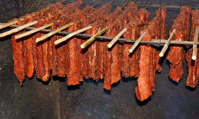Điều thú vị ở đây, thịt trâu sau khi ướp gia vị khoảng 3 tiếng đồng hồ sẽ được xiên que tre đem gác trên bếp, hun bằng củi cho khô dần để đem lại hương vị đặc trưng riêng cho món ăn. Thường để thịt có vị thơm ngon người dân bản địa sẽ dùng củi bàng tang, bã mía hoặc vỏ quýt hun.