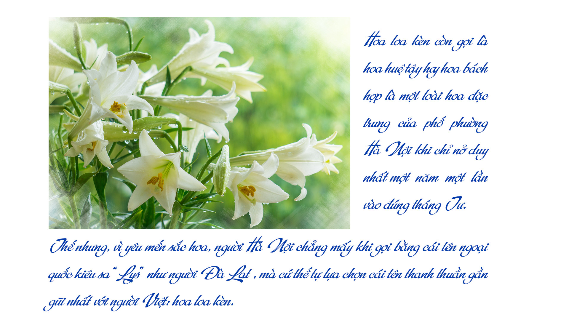 Chẳng biết từ bao giờ, mỗi khi sắc trắng tinh khôi hoa loa kèn chạm ngõ phố Hà Nội, ấy là lúc người Hà Nội giật mình thổn thức: Ra là mùa hè đã đến, tháng 4 đã ùa về.