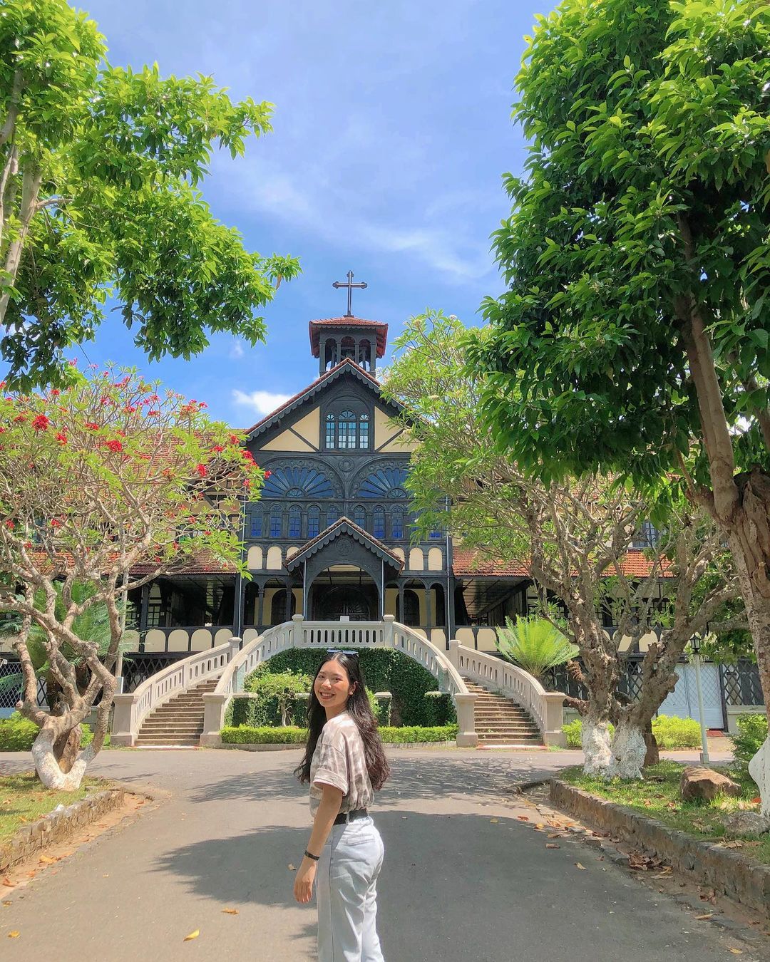 Bất kể ai đến đây cũng bị vẻ đẹp của tòa giám mục làm cho si mê, chỉ muốn giơ máy lên và chụp bằng hết những góc đẹp. Tuy nhiên, nơi đây có quy định chỉ cho du khách vào thăm quan chủ nhật hàng tuần. Nếu bạn lỡ đi vào ngày thường thì đừng vội buồn vì sợ không có chỗ check-in nhé. Ngay phía bên ngoài tòa giám mục là 2 hàng cây hoa đại, đằng xa là một tòa nhà rất ma mị được du khách rất yêu thích chụp ảnh đấy.