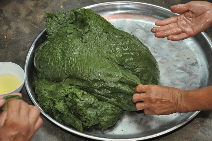 Với lá ngải cần chọn lá bánh tẻ thì bánh mới có màu xanh mướt đúng chuẩn, sơ chế sạch và đun cùng với nước tro bếp khoảng 2 - 3 tiếng. Nước tro để đun lá ngải phải sạch và thường là tro vỏ đậu xanh hay tro tre nứa. Cách lọc tro cũng cần phải “luyện sức bền”, người ta đổ nước từ từ vào tro để ngấm dần rồi chảy xuống chậu. Nước tro lúc đầu đặc có màu cà phê, sau đó loãng dần. Lá ngải đun trong nước tro rất nhanh nhừ. Sau khi đun nhừ, đổ lá ngải ra rổ, rửa nhiều lần cho sạch nước tro, nhặt bỏ xơ (gân lá, cuống lá già), vắt kiệt nước rồi nắm thành từng nắm bằng nắm tay. Xôi vừa chín đều thì bỏ vào giã cùng lá ngải cho thật đều và mịn, rồi nặn bánh thành hình tròn và làm dẹt ra để cho nhân vào giữa bánh.
