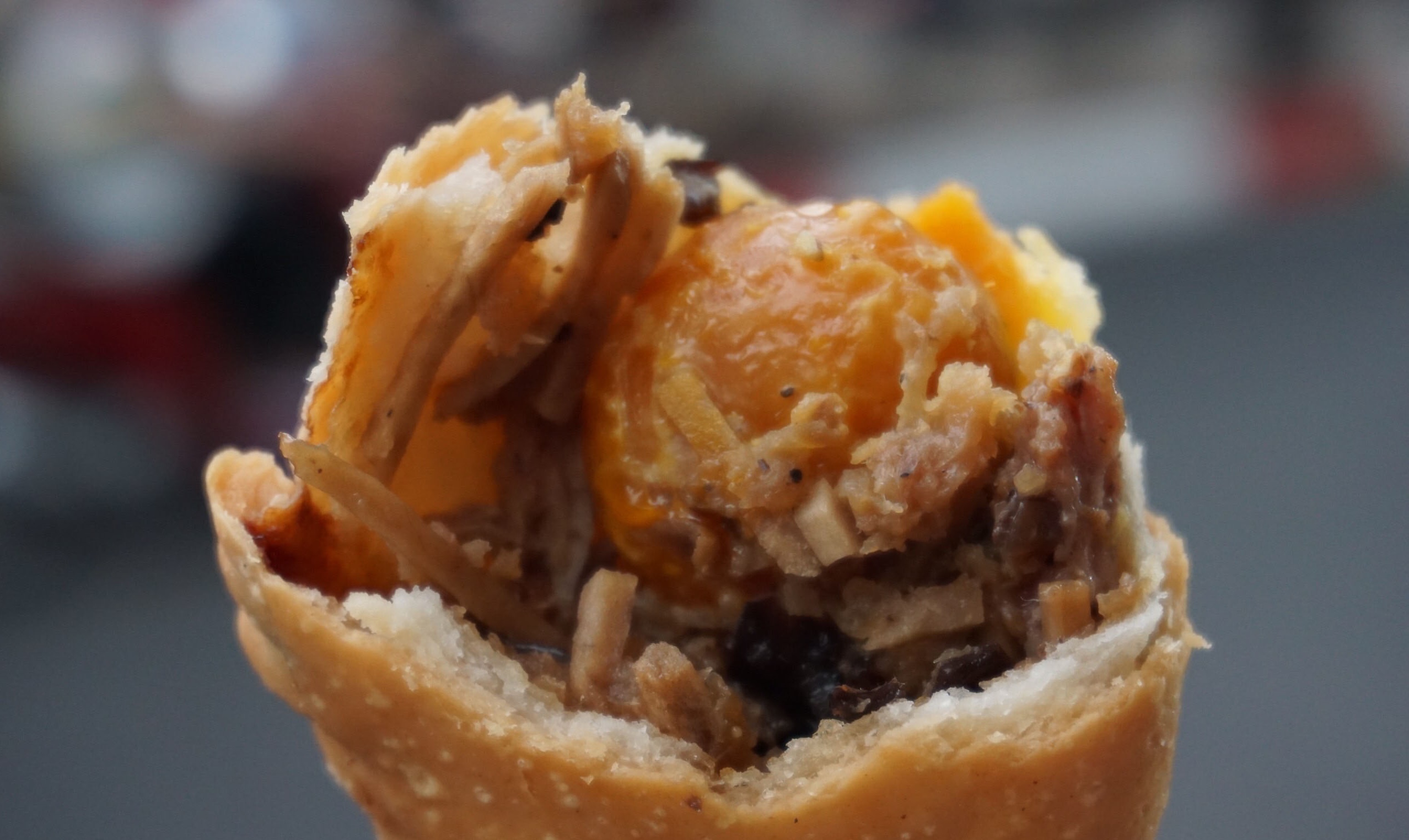 Món bánh “thần thánh” chúng ta nhắc tới ở đây chính là bánh quai vạc có nguồn gốc từ các tỉnh miền Trung. Ai có dịp ăn thử một lần cũng đều ngây ngất khó quên hương vị đường phố ấy. Món bánh thấm đẫm sự mộc mạc cùng với độ giòn, vị đậm đà đã chinh phục được những người khó tính nhất. Khi món bánh này “du lịch” đến Tp. Hồ Chí Minh thì người bán cũng đã biến tấu các loại nhân làm nên món bánh giúp trở về tuổi thơ này.