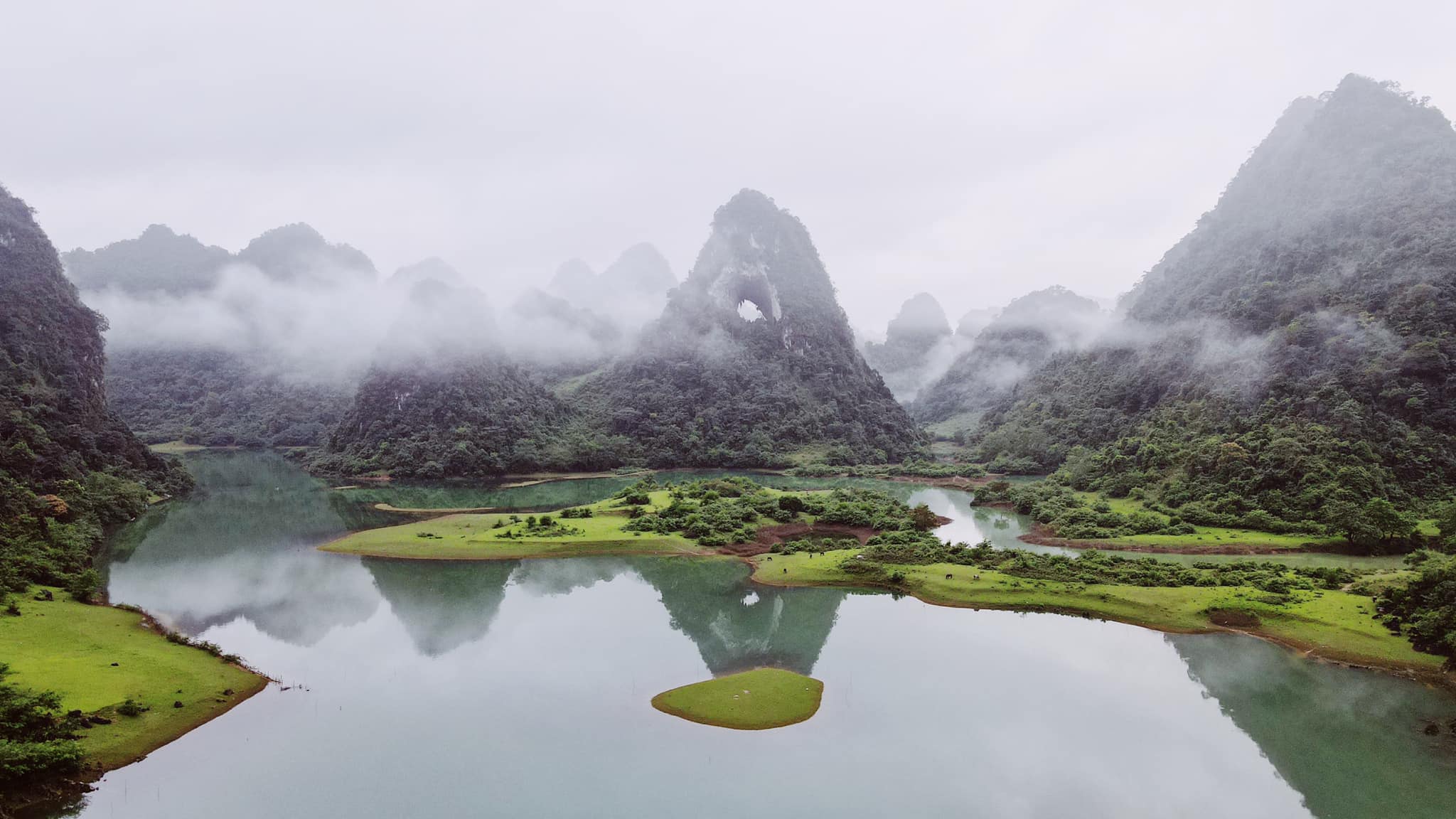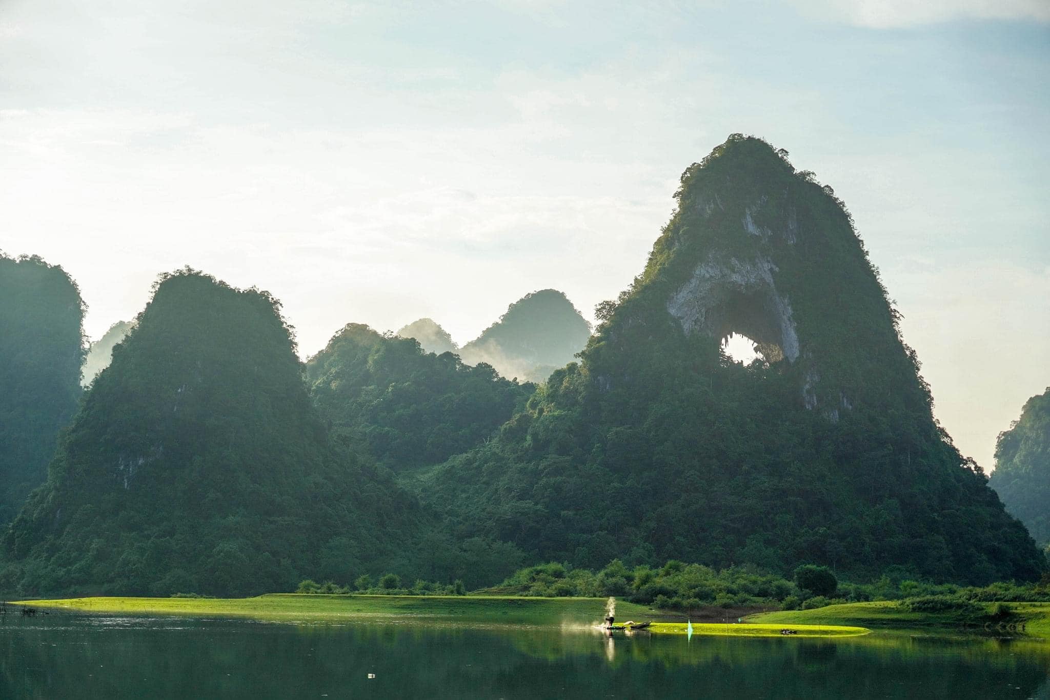 Không có gì thi vị bằng ngồi trên tảng đá lớn giữa hang, phóng tầm mắt về nhìn hai phía: cửa hang hướng Nam với cảnh sắc thơ mộng, những triền đồi nhấp nhô xanh mướt trải dài hút mắt đến tận dãy núi mờ sương cùng những hồ nước xanh biếc xung quanh; nếu nhìn cửa hướng Tây Bắc bạn sẽ thấy những nếp nhà sàn đơn sơ của người Tày nằm yên bình giữa núi non. Cảnh sắc nơi đây vào mỗi thời khắc đều mang theo những vẻ đẹp khác nhau, hữu tình nên thơ và quá đỗi tuyệt vời.