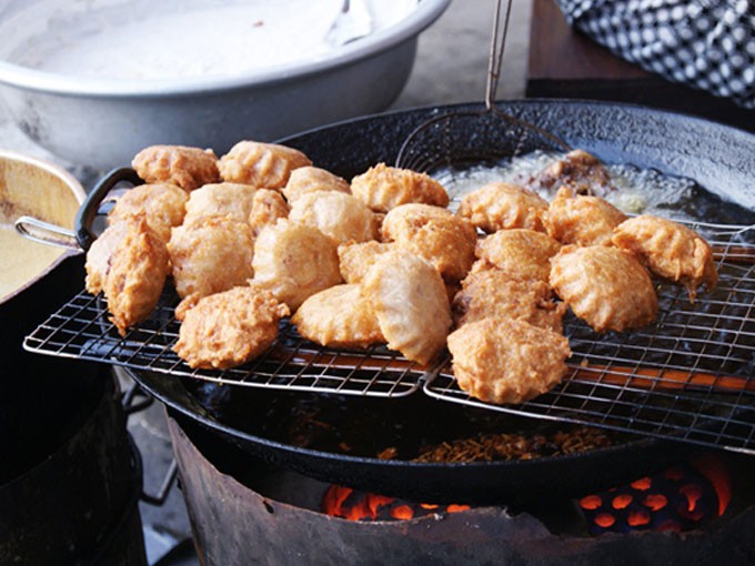 Món bánh áp chao nếu thoạt nhìn ban đầu mà không quan sát kỹ, bạn rất dễ bị nhầm với bánh rán. Trên thực tế, người dân Cao Bằng lại gọi là bánh áp chao thơm ngon khó quên. Chỉ cần một hũ bột, người chế biến sẽ nêm gia vị vừa vặn rồi cùng với một chảo dầu nóng, lấy khuôn ra đong từng đọt bột. Sau đó tất cả sẽ được người chế biến đem đi chiên chín. Món bánh này thường ăn kèm một số phụ gia và rau thơm.