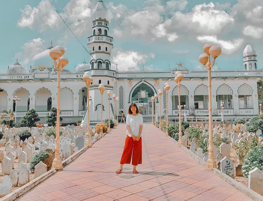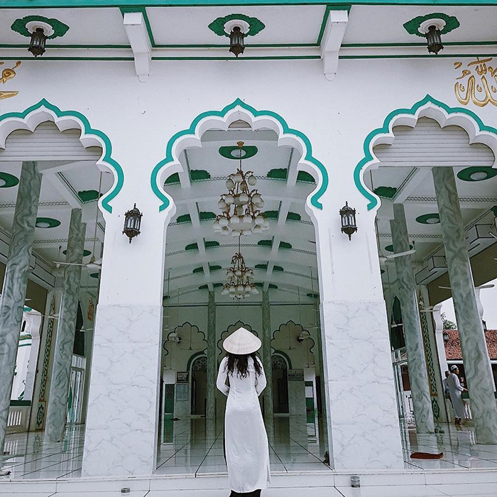 Ngay sau đó, trước mắt du khách đã hiện ra công trình có màu trắng tinh khôi, điểm tô bởi màu xanh đầy huyền bí nằm ngay giữa những cánh đồng lúa bát ngát. Đây chính là nơi các tín đồ Chăm Islam tại An Giang tụ họp, cầu nguyện và tìm chốn an lành.