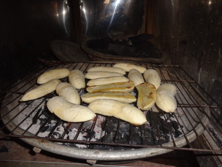 Nguyên liệu chính của món ăn này tất nhiên là chuối Xiêm rồi. Nhưng khâu lựa chọn cũng cần phải tinh tế, chọn chuối vừa chín tới với lớp vỏ đang ngả vàng, người địa phương thường gọi là “chín hường hường”. Tiếp đến là công đoạn sơ chế, chuối sẽ được tách sạch vỏ, cắt đôi và nướng trên bếp than củi tầm 5 phút để chuối săn lại. Sau đó, cho chuối vào túi ni-lông hoặc có thể đặt trực tiếp lên thớt rồi lấy chày hoặc thanh gỗ đập cho dẹp ra. Rồi nướng lại chuối thêm một lần nữa cho đều 2 mặt, đến khi chuối chuyển từ màu trắng đục ngả sang vàng là đã chín và lấy ra thưởng thức được ngay.