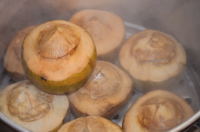 Để chế biến món cơm dừa, trước hết cần phải cắt phần đầu của quả dừa, lấy hết nước ra ngoài. Lúc này, quả dừa sẽ đóng vai trò như một chiếc nồi để thổi cơm. Tiếp đến là vo sạch gạo cho vào quả dừa và đổ phần nước dừa vừa lấy ra từ quả dừa xiêm trước đó thay nước lọc. Sau đó, đem quả dừa cho vào một chiếc nồi to để đun cách thủy. Món cơm dừa còn được biến tấu để trở nên hấp dẫn hơn với cà rốt, khoai tây, nấm hương, đậu cô ve hay hạt sen.