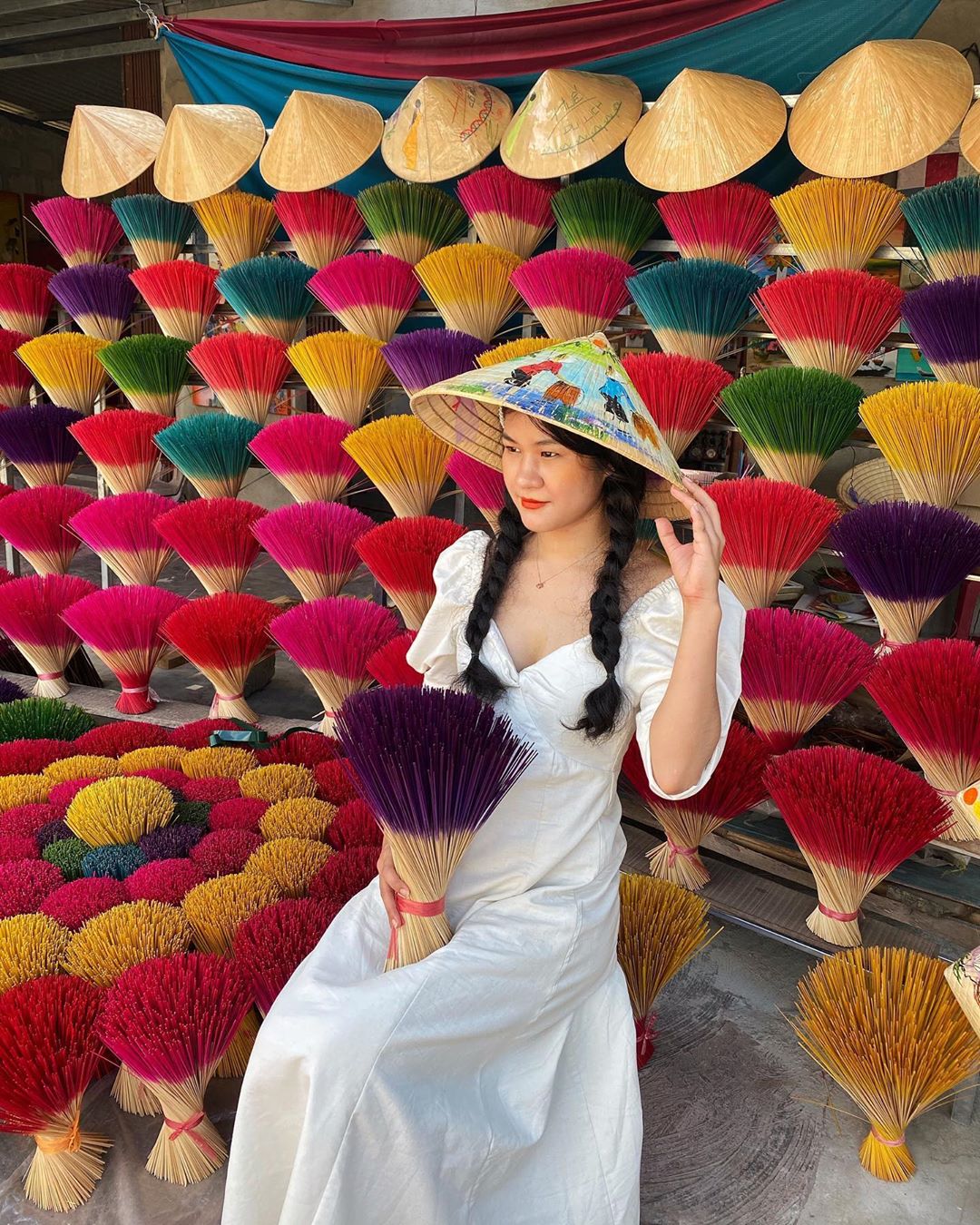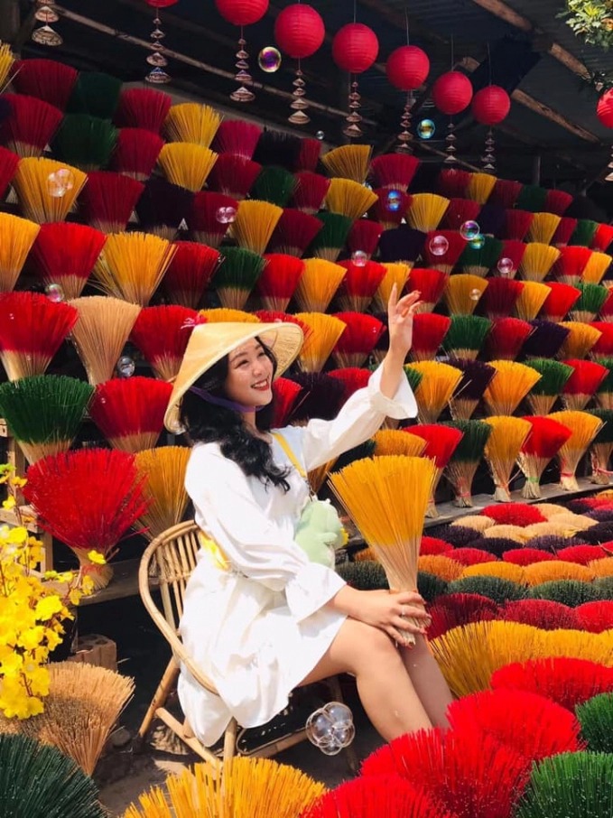 Ở làng hương Thủy Xuân, ban đầu chỉ có hương mang sắc nâu và đỏ, nhưng dần dần theo thời gian, xuất hiện nhiều loại hương thơm đặc trưng với phần chân hương đủ sắc màu như: tím, vàng. xanh, hồng… Nhìn từ xa, bó nào bó nấy cứ thế nở xòe thành những bông hoa ngập tràn hương sắc đầy tươi vui và rạng rỡ. Chẳng thế mà, đứng ở bất cứ góc nào đi nữa, bấm máy nhanh một cái, du khách sẽ có ngay những bức hình xinh xắn tuyệt đẹp y như trên trang bìa tạp chí.
