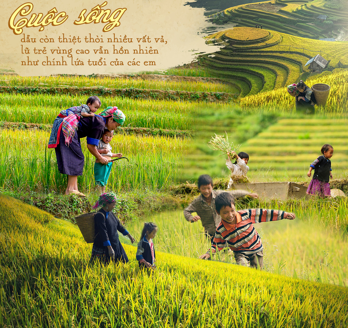 Mùa vàng Tây Bắc, không chỉ có vẻ đẹp hăng say lao động mà còn có ánh mắt hấp háy của lũ trẻ theo bố mẹ lên nương làm rẫy. Gương mặt ngây thơ hiền hòa cùng nụ cười trìu mến tươi vui của chúng cũng là điểm nhấn thú vị mà bạn sẽ chẳng thể tìm thấy ở nơi đâu. Lũ trẻ con háo hức theo chân bố mẹ, đứa ngồi trông em thơ ngoan ngoãn trên bờ, đứa phụ mẹ vận chuyển đám lúa chín vàng ngào ngạt, hay có đứa thơ thẩn chơi mình trên tán cây. Những hình ảnh giản dị khắc sâu vào tâm trí ai đó mãi mãi....