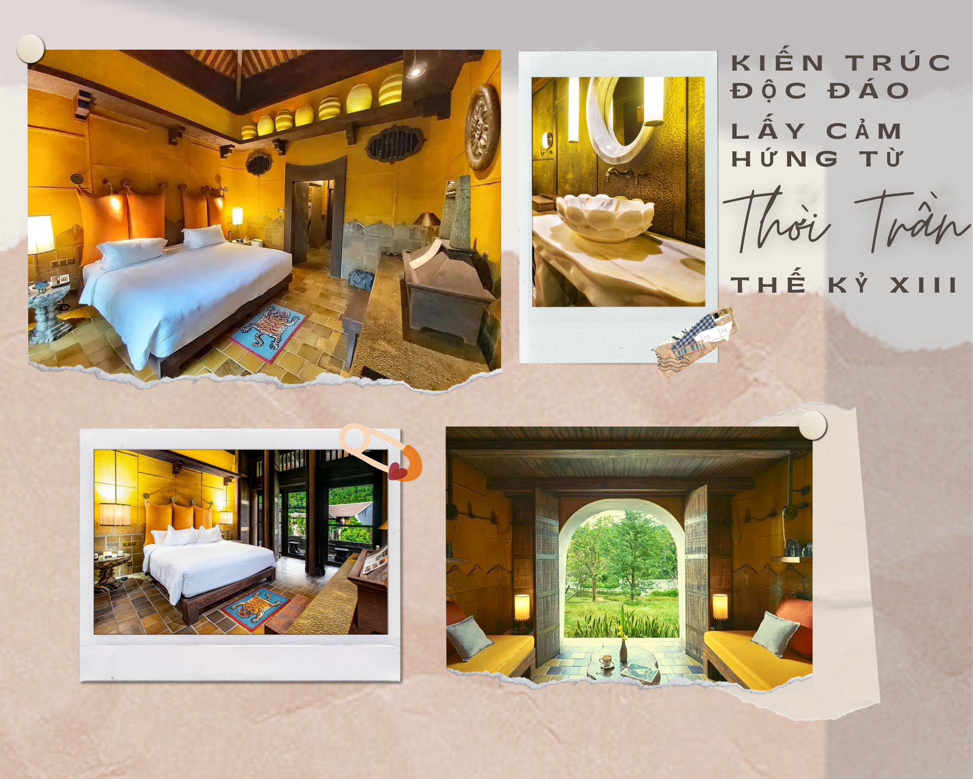 Những căn phòng được tái hiện lại khung cảnh thời vua Trần Nhân Tông, các chất liệu trang trí độc đáo phong cách hoài cổ như: Vỏ bao bố làm bằng sợi đay, cửa gỗ then cài kiểu xưa và sàn nhà làm từ loại gốm địa phương gần như đã thất truyền… Đặc biệt, phòng nghỉ không hề có tivi – một sự cắt giảm có mục đích để duy trì cảm giác nghỉ ngơi và kết nối bản thân tại khu tĩnh dưỡng huyền bí này.