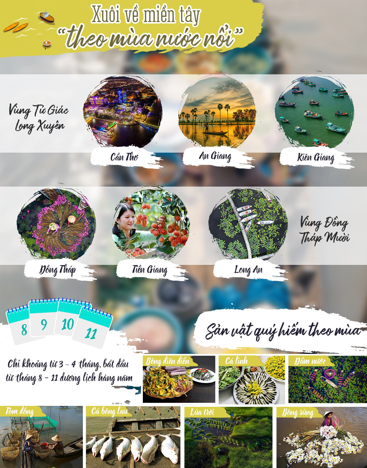 Vốn là hiện tượng lũ lụt ở các tỉnh đầu nguồn Đồng bằng sông Cửu Long, “đến hẹn lại lên” cứ đến mùa nước nổi thay vì canh tác nông nghiệp thông thường, người miền Tây lại tận dụng lợi thế thiên nhiên, chuyển sang khai thác nguồn sản vật dồi dào có sẵn do những con nước mênh mông đổ về. Ngập tràn cá tôm, sản vật đặc trưng theo dòng nước lũ từ thượng nguồn sông Mekong ùa về, tạo nên “biển nước” thiên nhiên tươi đẹp mà trù phú.