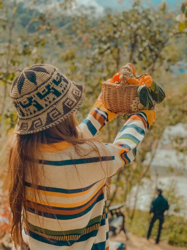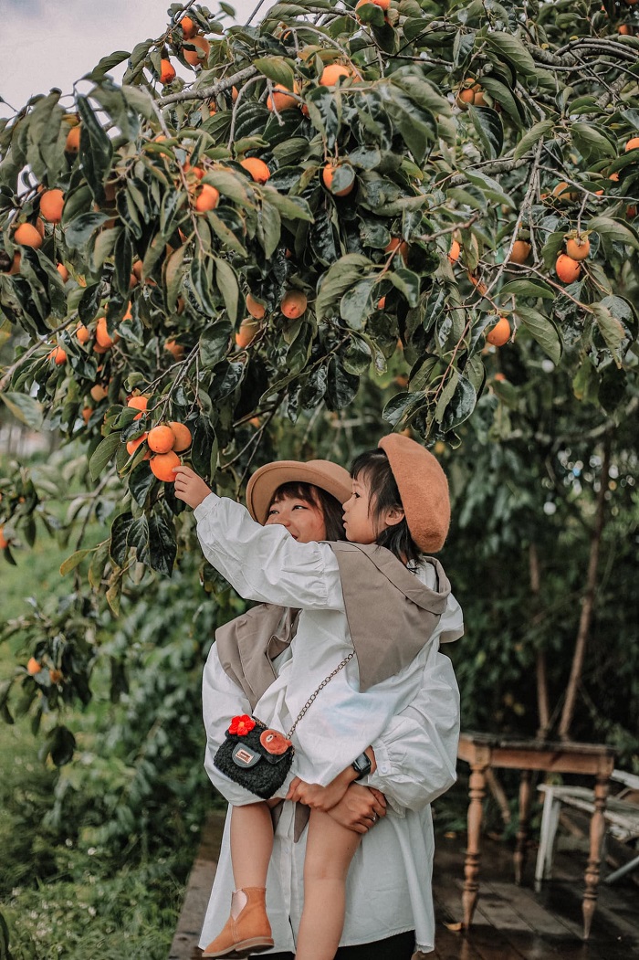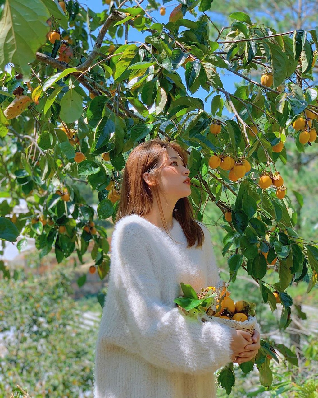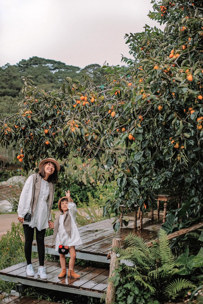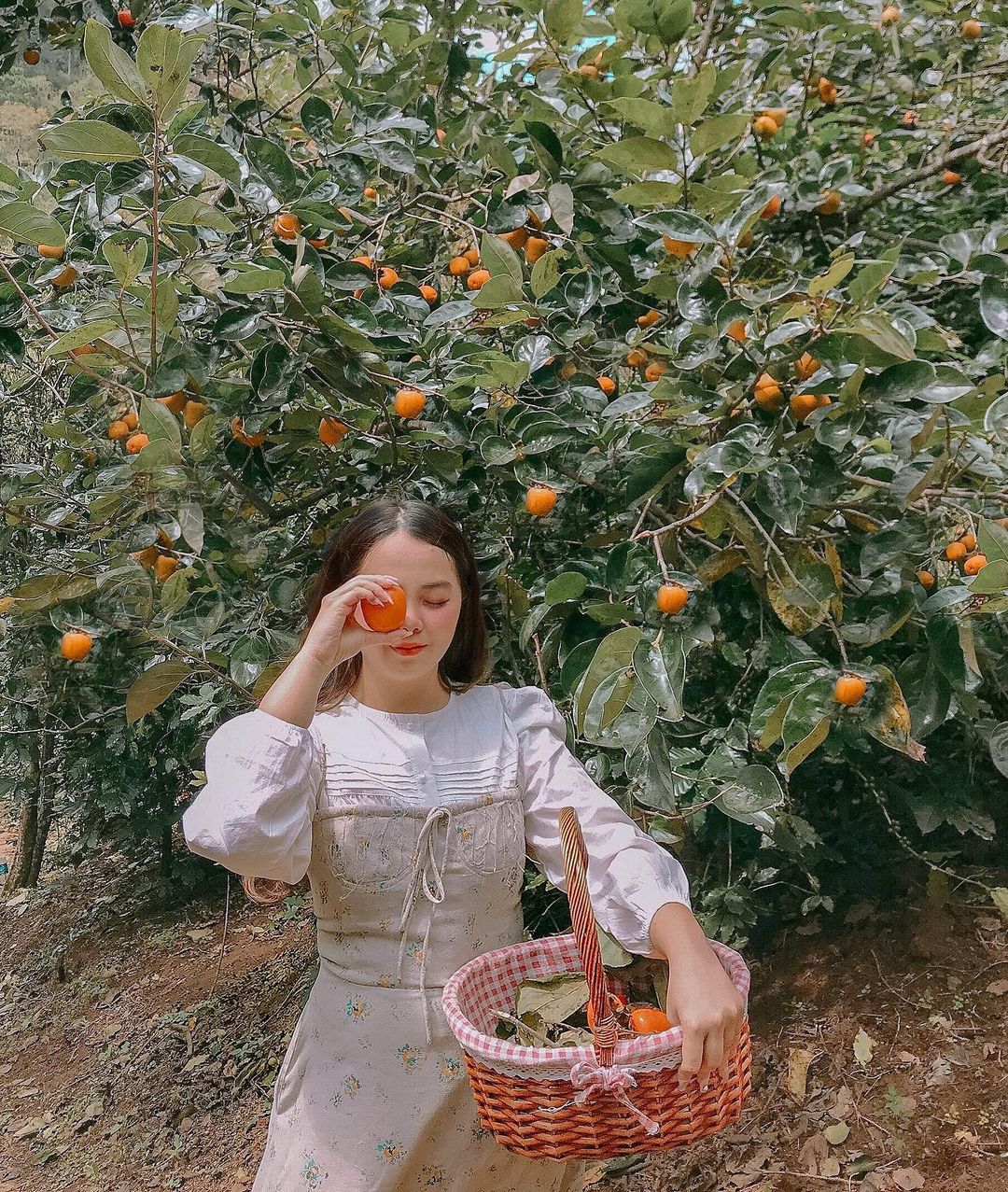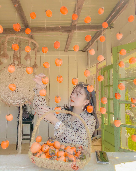 Mỗi cây hồng tính sơ sơ có hàng trăm trái hồng xanh rồi chín, treo lủng lẳng như những chiếc đèn lồng rực rỡ điểm tô cho khu vườn bội phần đẹp hơn. Khi đã chụp ảnh “sống ảo” chán chê, bạn có thể nhờ chủ vườn xuống hái hồng rồi trả tiền để mua về làm quà đấy nhé. Vừa được ngắm cảnh đẹp, chụp ảnh lại có quà mang về thì còn gì bằng.